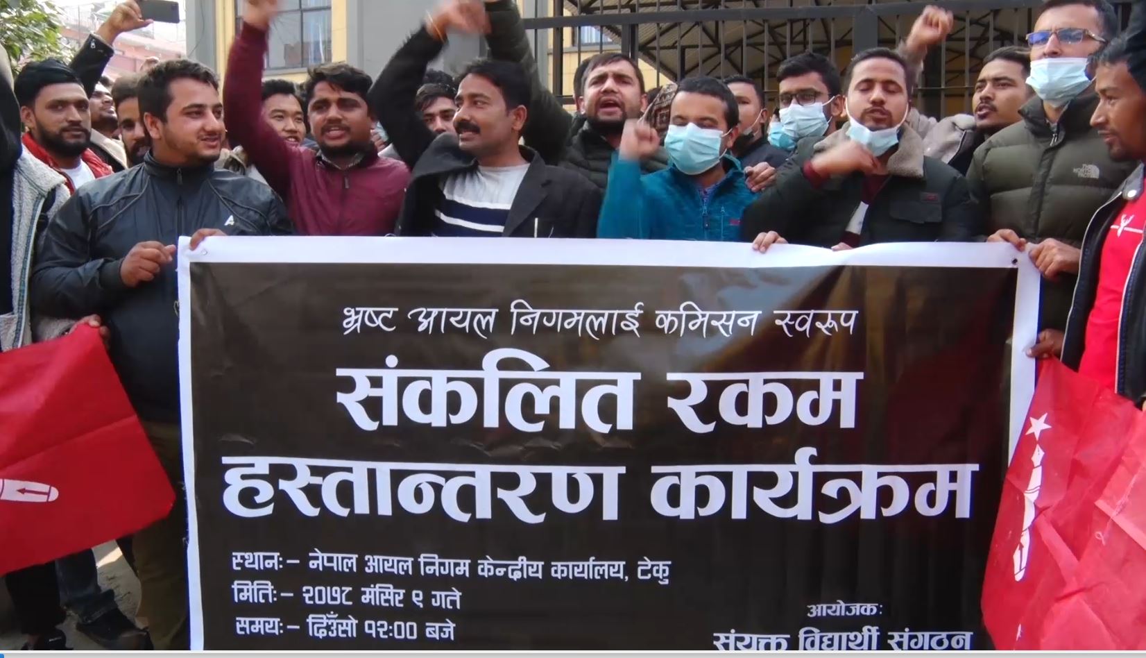 संयुक्त विद्यार्थी संगठनहरुले नेपाल आयल निगमलाई कमिशन स्वरुप एक रुपैयाँ अभियान सञ्चालन गरि संकलन गरिएको रकम हस्तान्तरण गरेका छन् । विहिबार निगमको केन्द्रीय कार्यालय टेकुमा पुगरेर विद्यार्थी संगठनहरुले विरोध स्वरुप रकम हस्तान्तरण गरेका हुन । उनीहरुले निगम परिसरमा नारा जुलश गर्दै आयल निगमका भ्रषटाचारीहरु होसियार, आयल निगमका भ्रष्ट कर्मचारीहरु राजीनामा दे, पेट्रोलिएम पदार्थमा गरिएको मूल्यविद्धि खारेज गर लगायतका नारा लगाएका थिए । संयुक्त विद्यार्थी संगठनका नेताहरुले आयल निगमले पेट्रोलियम पदार्थमा गरिएको मूल्यविद्धि फिर्ता नलिए कडा आन्दोल गर्न बाध्य हुने चेतावनी समेत दिए ।