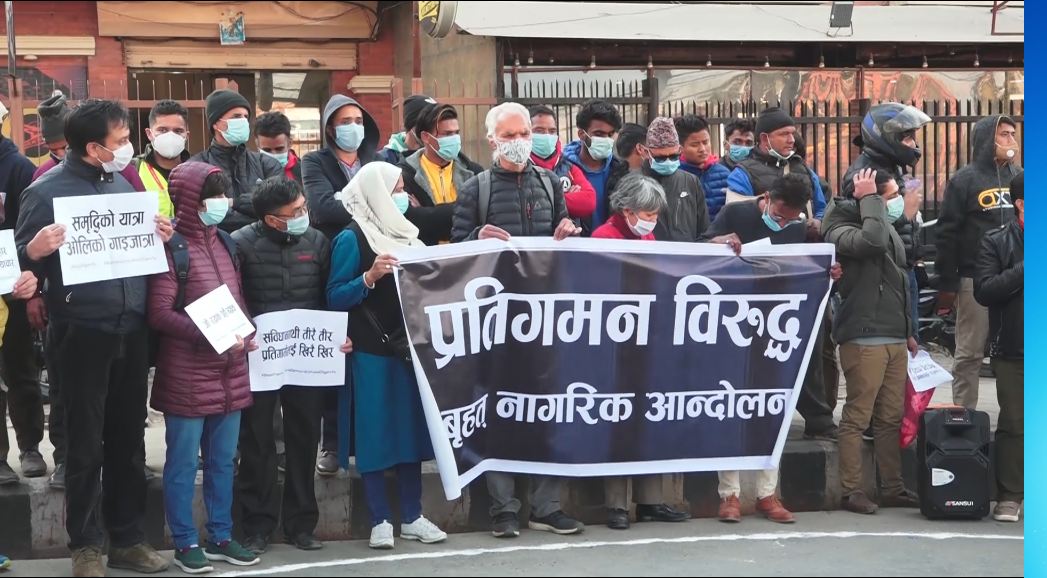 नागरिक समाजका अगुवाहरुले प्रतिनिधि सभा विघटन असंवैधानिक भन्दै माइतीघर मण्डलामा विरोध प्रदशर्न गरेका छन् । प्रदर्शनमा सहभागिहरुले शंख बजाएर विरोध गरेका छन् । ‘प्रतिगमन विरुद्ध बृहत नागरिक आन्दोलन’ लेखिएको ब्यानर सहित सहभागिहरुले शंख बजाउँदै संसद विघटनको विरोध गरेका हुन् । नेपालको संविधानमाथि प्रहार भएकोले विरोध प्रदर्शन गर्नु परेको वृहत नागरिक आन्दोलनमा सहभागि अधिकारकर्मीहरुले बताएका छन् । सरकारले संसद विघटन गरेर देशलाई प्रतिगमन तर्फ लगेको भन्दै सरकारको यो कदम संसद विघटन मात्रै नभई संविधान माथिकै आक्रमण भएको उनीहरुको भनाई छ ।