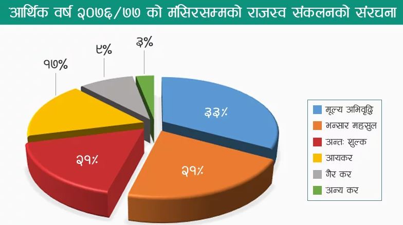 सरकारले चालु आर्थिक वर्ष २०७६र७७ मा कूल ११ खर्ब १२ अर्ब रुपैयाँ राजस्व संकलनको लक्ष्य राखेको छ । यसमध्ये भन्सार विभागलाई मात्र झण्डै ५० प्रतिशत राजस्व संकलनको लक्ष्य दिइएको छ । भन्सार महसुल, वस्तु पैठारीमा लाग्ने मूल्य अभिवृद्धि कर र अन्तशुल्कः भन्सार विभागले संकलन गर्छ ।