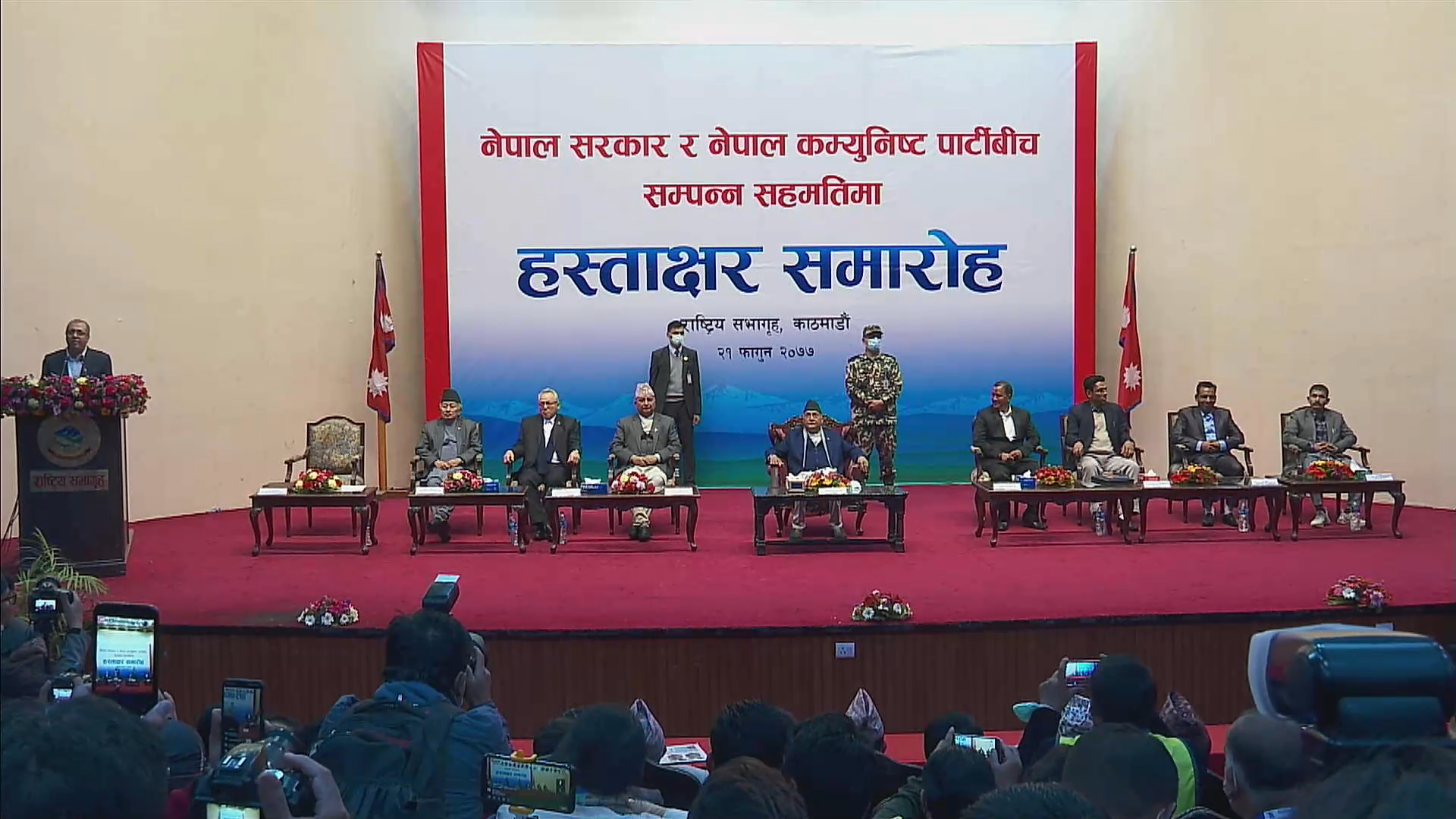 हस्ताक्षर समारोहमा सरकारका वार्ता टोलीका सदस्य एवं प्रधानमन्त्रीका विदेश सल्लाहाकार भट्टराईले विगत एक बर्षदेखिको निरन्तरको प्रयास पछि वार्ता निष्कर्षमा पुगेको स्पष्ट पार्नुभयो । हस्ताक्षर समारोह आयोजित राष्ट्रियसभाहलको कार्यक्रम कक्ष स्वदेशी र विदेशी संञ्चारकर्मी र मन्त्री एवं नेताहरुको सुरक्षामा खटिएका सुरक्षाकर्मीले खचाखच भरिएको थियो ।