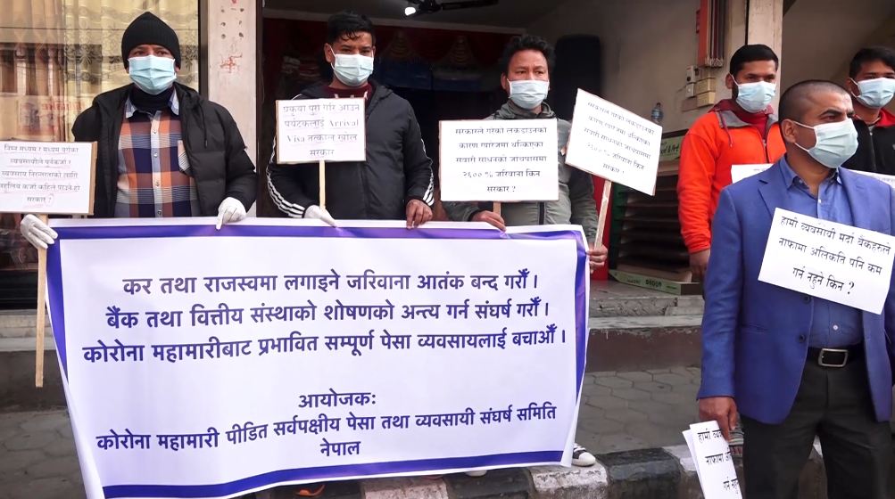 सहज ढंगले व्यवसाय गर्ने वातावरण बनाइदिन माग गर्दै कारोना महामारीबाट पीडित विभिन्न पेसा तथा व्यवसायीहरु संघर्षमा उत्रिएका छन। मंगलबार बालुवाटारमा सडक प्रदर्शन गर्दै कोरोना महामारी पीडित विभिन्न पेसा तथा व्यवसायीहरु संगठित रुपमा संघर्षमा उत्रिएका हुन। लकडाउनका कारण ग्यारेजमा थन्किएका सवारी साधनको जाँचपासमा २६ सय प्रतिशतसम्म जरिवाना गरिएको प्रक्रिया पुरा गरेर पनि पर्यटकलाई एराइभल भिसा नखोलेको तथा निम्न मध्यम र मध्यम वर्गका व्यवसायीले पुर्नकर्जा र व्यवसाय निरन्तरताका लागि सहुलियत कर्जा नपाएको भन्दै व्यवसायीहरु आन्दोलित भएका हुन। मौद्रिक नीतिमा साना व्यवसायीलाई नसमेटिएको तथा बैंकको अन्याय अत्याचार बढेका कारण आन्दोलनमा आउनुपरेको नेपाल पर्यटक यातायात व्यवसायी संघका अध्यक्ष रामहरी शर्माले बताउनुभयो।