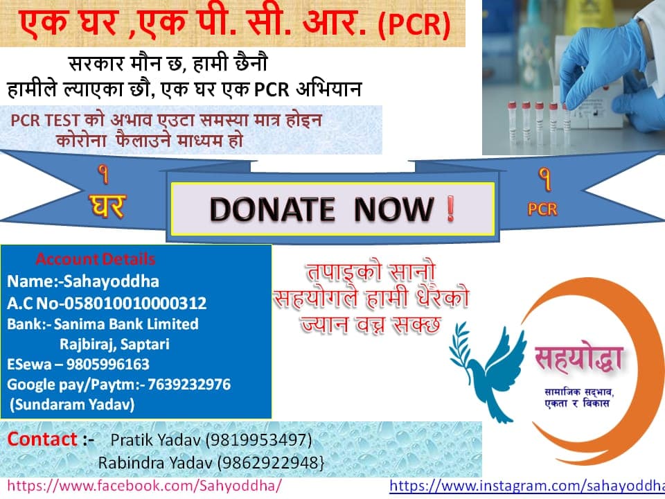 सहयोद्धा नामक सामाजिक संस्थाले राजविराजमा एक घर एक पिसिआर अभियान सुरु गरेको छ । सप्तरीको राजविराज नगरपालिकालाई केन्द्रित गरेर उक्त संस्थाले एक घर एक पिसिआर परिक्षण गर्नेगरि अभियान सुरु गरेको हो। संस्थाले पिसिआर परिक्षण गर्नका लागि स्थायीको घरघरमा पुगेर स्वाब संकलन गर्नेछ। स्वाब संकलन गर्नका लागि आवस्यक पर्ने भिटिएम कीट खरिदका लागि सहयोग रकम समेत संकलन गरिरहेको संस्थाका अध्यक्ष रबिन्द्र यादवले जानकारी दिए ।” एक घर एक पिसिआर,आफैं जुटौं, मौन छ सरकार ” भन्ने मुल नाराका साथ सुरु गरिएको अभियानले कम्तीमा एक घरबाट एकजनाको स्वाब संकलन गरि परिक्षणका लागि गजेन्द्र नारायण अस्पतालमा पठाउनेछ ।