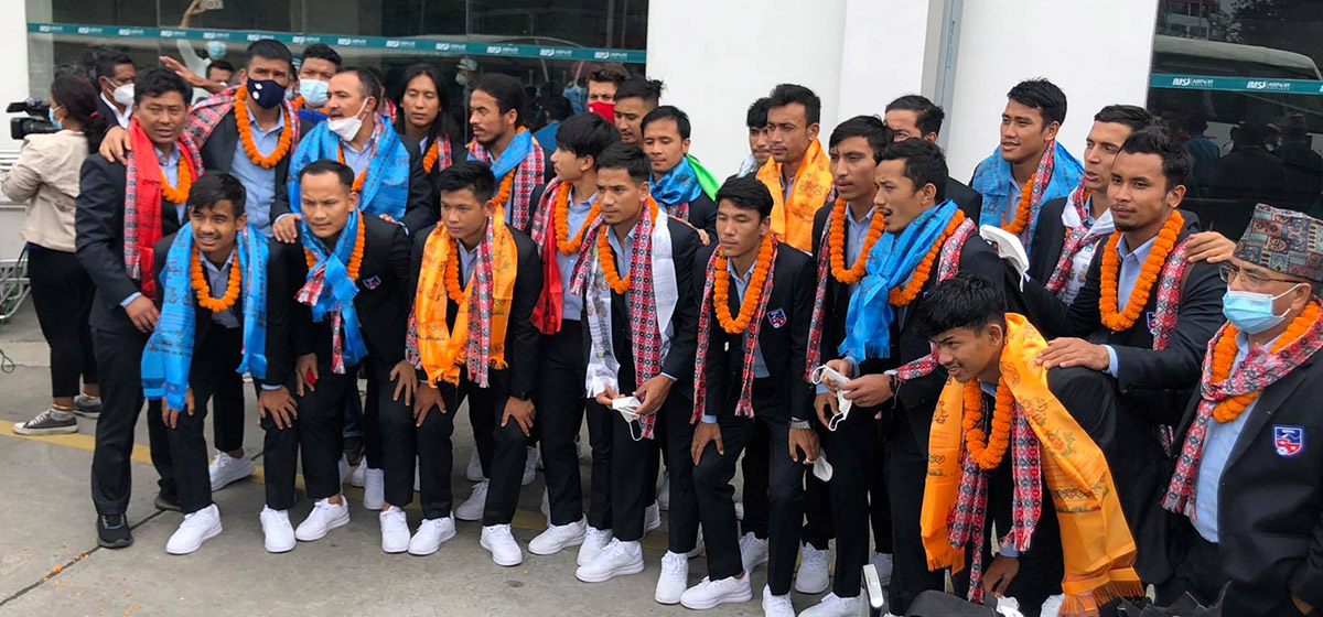 माल्दिभ्समा आयोजना भएको साफ च्याम्पियनसिप फुटबलमा उपविजेता बनेको नेपाली राष्ट्रिय फुटबल टिम स्वदेश फर्किएको छ । सोमबार बिहान स्वदेश फर्किएको नेपाली टोलीलाई खेलकुद मन्त्री महेश्वर गहतराज तथा अखिल नेपाल फुटबल संघ (एन्फा) का पदाधिकारी लगायतले भव्य स्वागत गरे । नेपाली टोलीलाई स्वागत गर्न ठूलो संख्यामा फुटबल समर्थकहरु विमानस्थल पुगेका थिए । मालेमा शनिबार राति भएको फाइनलमा नेपाल भारतसँग ३–० ले पराजित भएको थियो । फाइनलमा पराजित भएपछि नेपाल ऐतिहासिक उपाधि जित्नबाट बन्चित भएको थियो । तर, नेपाल पहिलो पटक साफको उपविजेता बनेको हो । स्वदेश फकिएपछि नेपाली टोलीका कप्तान किरण कुमार चेम्जोङले उपाधि जित्नबाट बञ्चित भए पनि अहिलेको प्रदर्शनका आधारमा खेलाडीहरुलाई आगामी अन्तर्राष्ट्रिय प्रतियोगितामा खेल्न थप हौसला मिलेको बताउनुभयो । उहाले लगातार दुई गोल हुँदा खेलाडीको मनोबल पनि कमजोर भएको तर्क गर्नुभयो । उहाले नयाँ खेलाडीहरुलाई पनि अहिलेको अनुभवले आगामी दिनमा सहज हुने बताउनुभयो । किरणले फाइनमा प्रशिक्षक र अञ्जन बिष्टको अभाव देखिएको पनि बताउनुभयो । त्यस्तै खेलकुदमन्त्री गहतराजले नेपाली राष्ट्रिय फुटबल टिमको प्रदर्शनबाट गौरबको अनुभव भएको बताउनुभयो । नेपालको खेलबाट सरकारले आशा र भरोषा गरेको उहाको भनाई छ । मन्त्री गहतराजले खेलकुद क्षेत्रको बिकासका लागि सरकारले कुनै कसर बाँकी नराख्ने धारणा राख्नुभयो । नेपाललाई फाइनलसम्म पुर्याउन सफल मुख्य प्रशिक्षक अब्दुल्लाह अल्मुताइरीले भने नेपाल फर्कनुभएन । नेपालले फाइनलमा स्थान बनाएलगत्तै अलमुताइरीले साफ च्याम्पियनसिप सकिएपछि नेपाल छाड्ने घोषणा गर्नुभएको थियो । अलमुताइरी गत चैतमा एक वर्षको लागि नेपालको प्रशिक्षक नियुक्त हुनुभएको थियो।