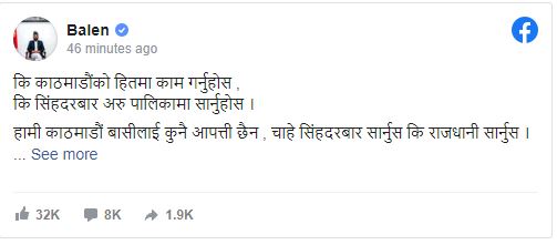 बिहीबार सामाजिक सञ्जालमार्फत् उनले लेखेका छन, ‘कि काठमाडौंको हितमा काम गर्नुहोस् , कि सिंहदरबार अरु पालिकामा सार्नुहोस्।’ ‘हामी काठमाडौंबासीलाई कुनै आपत्ति छैन। चाहे सिंहदरबार सार्नुस् कि राजधानी सार्नुस्। हामीलाई हाम्रो सम्पदा, संस्कृति, कला, सभ्यता चाहिन्छ, राजनीति हैन’।