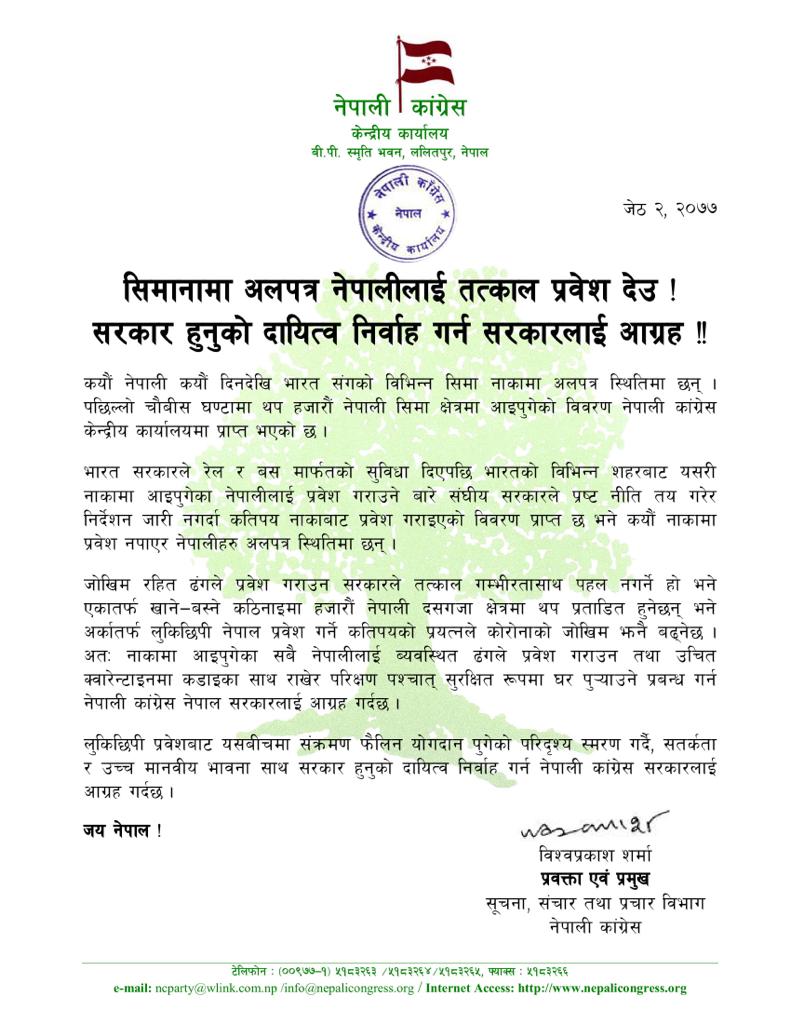 प्रमुख प्रतिपक्षी दल नेपाली काँग्रेसले सीमानामा अलपत्र नेपालीहरूलाई तत्काल स्वदेश भित्र्याउन माग गरेको छ। नेपाली काँग्रेसका प्रवक्ता विश्वप्रकाश शर्माले शुक्रबार एक विज्ञप्ति जारी गर्दै सीमामा अलपत्र परेका नेपालीहरूलाई नेपाल प्रवेश गराउन माग गर्नुभएको हो।