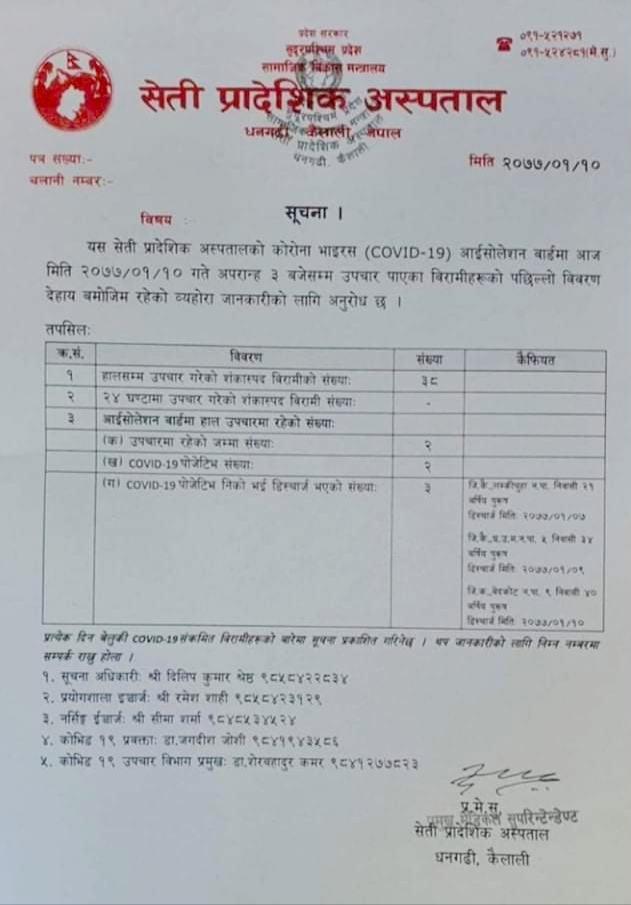 अहिले धनगढी उप–महानगरपालिका वडा नम्वर 5 कि 34 वर्षीय महिला र लम्की चुहा नगरपालिका वडा नम्वर 1 कि 65 वर्षीय महिलाको सेती प्रादेशिक अस्पतालको आईसोलेसनमा उपचार भईरहेको छ। अन्य केही शंकास्पद बिरामीको समेत उपचार भईरहेको छ।