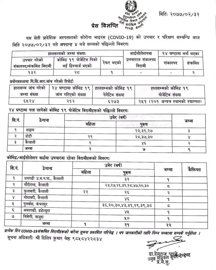 सेती प्रादेशिक अस्पतालका प्रमुख मेडिकल सुपरिन्टेन्डेण्ट डा हेमराज पाण्डेद्धारा जारी गरिएको सूचना अनुसार थपिएका संक्रमित मद्ये कैलालीका २ बर्षिय बालिका, ४६ बर्षिय पुरुष, अछामका २३, ३१ र २७ बर्षिय पुरुष र डोटीका २१ बर्षिय महिला र २८, ३० र ३७ बर्षिय पुरुष रहेका छन ।
