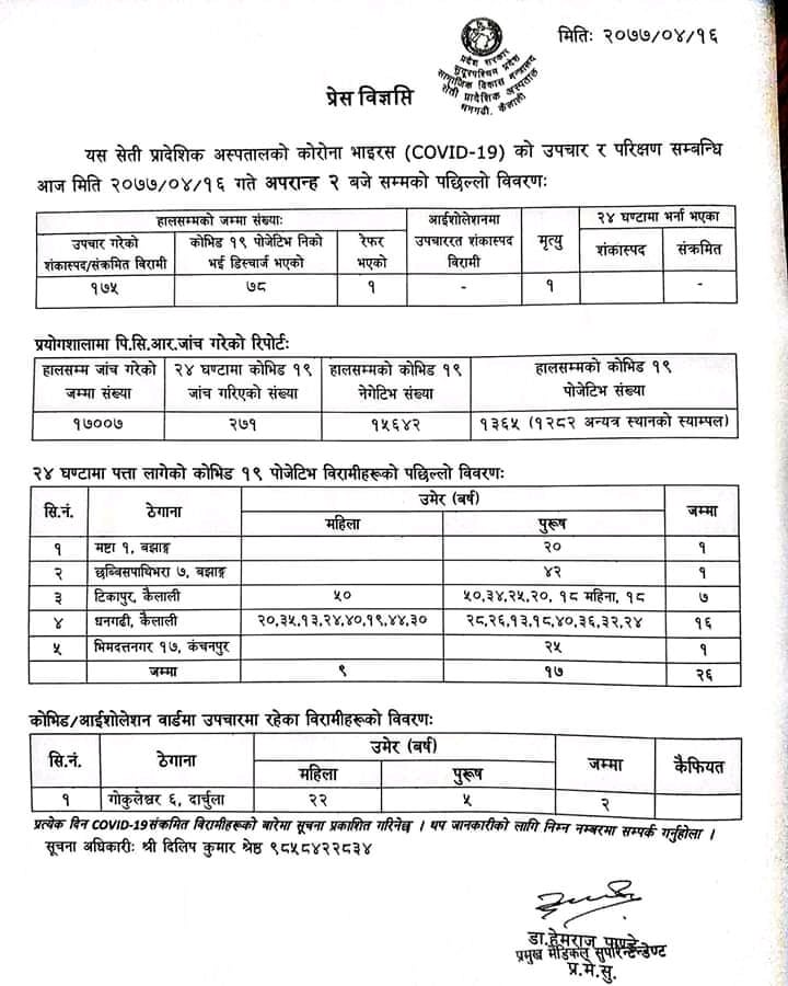 सेति प्रादेशिक अस्पतालका अनुसार कैलालीको धनगढी उप–महानगरपालिकाका 16, टीकापुरगका 7, बझाङको मष्टा–1 का 20 वर्षीय पुरुष, छव्विस पाथिभेरा गाउँपालिका वडा नम्वर 7 का 42 वर्षीय पुरुष, कञ्चनपुरको भीमदत्त नगरपालिका वडा नम्वर 17 का 25 वर्षीय पुरुषमा कोरोना देखिएको छ।