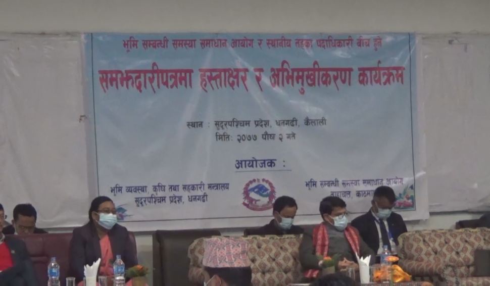 सुदूरपश्चिम प्रदेशका भुमिहिन नागरिकलाई लालपुर्जा वितरणको गृहकार्य शुरु भएको छ । भूमि सम्बन्धी समस्या समाधान आयोगले सुदूरपश्चिमका १७ वटा स्थानीय तहसँग सम्झौता गरी काम अघि बढाएको हो । सरकारले एक सय वटा पालिकामा भूमि ब्यवस्था सम्बन्धी काम गर्न निर्देशन दिएको भएप्नि स्थानीय तहहरुको तत्परताका कारण १ सय ८७ पालिकासँग सम्झौता गरेको भूमि सम्बन्धी समस्या समाधान आयोगका अध्यक्ष देवी प्रसाद ज्ञवालीले बताउनु भएको छ । बिहीबार आयोगका अध्यक्ष ज्ञवाली र सुदूरपश्चिमका १५ वटा स्थानीय तहबीच भूमिहीन सुकुमवासीलाई जग्गा वितरण गर्ने सम्झौतापत्रमा हस्ताक्षर भएको छ । यस अघि दुईटा स्थानीय तहसँग सम्झौता भइसकेको थियो । सम्झौता पत्रमा हस्ताक्षर गरेपछि स्थानीय तहका प्रमुखहरुले भूमि सम्बन्धी समस्या समाधान गर्न आफुहरु तत्पर रहेको बताएका छन् ।