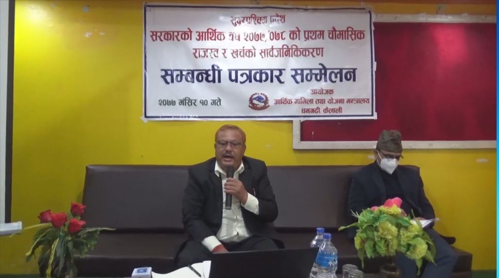 सुदूरपश्चिम प्रदेश सरकारले चालु आर्थिक वर्षको पहिलो चौमासिकको खर्च तथा राजस्व संकलन विवरण सार्वजनिक गरेको छ। आर्थिक मामिला तथा योजना मन्त्रालयले बुधवार धनगढीमा पत्रकार सम्मेलन गरी खर्च तथा आम्दानी सार्वजनिक गरेको हो। प्रदेश सरकारले पहिलो चौमासिकमा कुल बजेटको ६ दशमलव २९ प्रतिशत अर्थात् २ अर्ब ९ करोड ८६ लाख ३६ हजार रुपैयाँ खर्च गरेको छ । चालू आर्थिक वर्ष २०७७/०७८ को प्रथम चौमासिक सम्मको बजेट खर्च र राजस्व संकलनको अवस्था सार्वजनिक गर्दै आर्थिक मामिला तथा योजना मन्त्री झपट बोहराले यस वर्ष गत वर्ष भन्दा १ दशमलव ७६ प्रतिशतले खर्च वृद्धि भएको बताउनुभयो । गत वर्ष पहिलो चौमासिकमा कुल बजेटको ४ दशमलव ५३ प्रतिशत मात्रै खर्च भएकोमा यस वर्ष चालु तर्फ १ अर्ब १० करोड ४७ लाख ५० हजार अर्थात् ६ दशमलव ६५ प्रतिशत र पूँजीगत तर्फ ९९ करोड ३८ लाख ७६ हजार अर्थात् ५ दशमलव ९३ प्रतिशत खर्च भएको मन्त्री बोहराले बताउनुभयो । गत आर्थिक वर्षको पहिलो चौमासिकमा चालु तर्फ ५ दशमलव ४० प्रतिशत र पूँजीगत तर्फ ३ दशमलव ५२ प्रतिशत मात्रै खर्च भएको थियो । प्रदेश अर्थमन्त्री बोहराले यस वर्ष चालु तर्फ १ दशमलव २५ र पूँजीगत तर्फ २ दशमलव ४१ प्रतिशतले खर्च बढी भएको बताउनुभयो ।