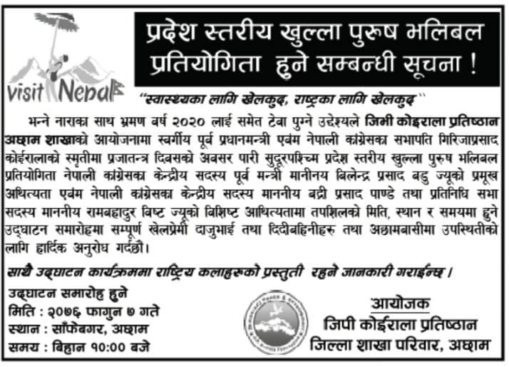 जिपि काेईराला प्रतिष्ठान अछाम शाखाकाे आयाेजनामा स्वर्गीय पूर्व प्रधानमन्त्री एवंम नेपाली काँग्रेसका सभापति गरिजा प्रसाद काेईरालाकाे स्मृतीमा प्रजातन्त्र दिवसकाे अवसर पारी फागुन ७ देखि साँफेबगरमा संचालन हुने सुदूरपश्चिम प्रदेश स्तरिय खुल्ला पुरुष भलिबल प्रतियोगिताको उद्घाटन नेपाली कांग्रेसका केन्द्रिय सदस्य पूर्व मन्त्री एवंम माननिय दिलेन्द्र प्रसाद बडुबाट गराउने निर्णय गर्दै जिपी कोईराला प्रतिष्ठान अछामको बैठक सम्पन्न भएको छ ।