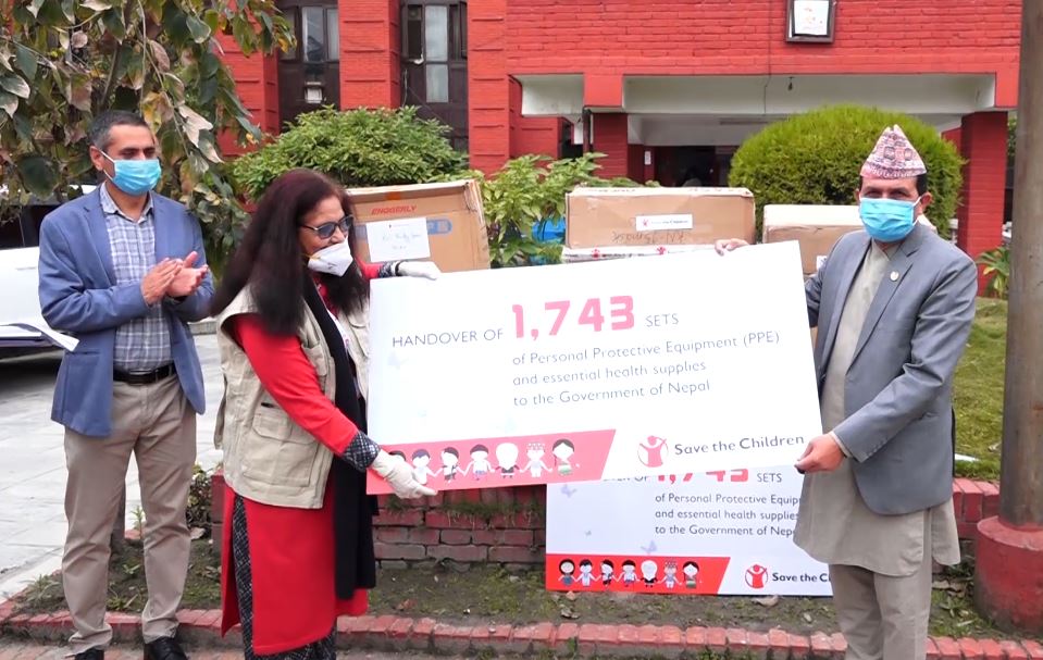 कोरोना भाइरस रोकथाम तथा नियन्त्रणका लागि सेभ द चिल्ड्रेनले सरकारलाई विभिन्न स्वास्थ्य सामग्रीहरु उपलब्ध गराएको छ। सेभ द चिल्ड्रेनले आईतबार स्वास्थ्य तथा जनसंख्या मन्त्री भानुक्त ढकाललाई पीपीई लगायतका स्वास्थ्य सामग्री उपलब्ध गराएको हो। सेभ द चिल्ड्रेनले 1 हजार 743 थान पीपीई सहित एन 95 मास्क लगायतका स्वास्थ्य सामग्री उपलब्ध गराएको हो। स्वास्थ्य सामग्रीहरु मध्ये 343 थान पीपीई प्रदेश नम्बर 2 को लागि र 2 सय थान कर्णाली प्रदेशको लागि उपलब्ध गराइदिन सेभ द चिल्ड्रेनले मन्त्रालयलाई आग्रह समेत गरेको छ। बाँकी 1 हजार 200 थान पीपीई र अन्य स्वास्थ्य सामग्री भने मन्त्रालयले आवश्यकताका आधारमा कोरोनाको उपचार हुने स्वास्थ्य संस्थामा उपलब्ध गराउन सक्ने छ।