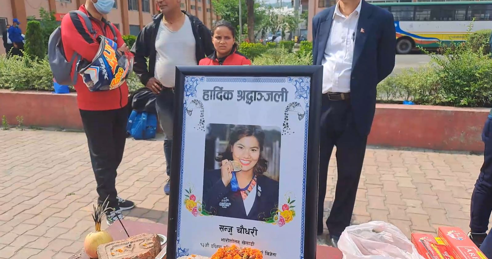 13 औं दक्षिण एसियाली खेलकुद (साग) मा स्वर्ण पदक विजेता भारोत्तोलन खेलाडी सन्जु चौधरीको मृत्यु भएको छ । मंगलबार ललितपुरको लुभुस्थित भारोत्तोलन प्रशिक्षक संजय महर्जनको घरमा सन्जु मृत भेटिएकी हुन् । यस्तै खेलाडी स्व. सञ्जु चौधरीलाई राष्ट्रिय खेलकुद परिषदमा मंगलबार अन्तिम श्रद्धान्जली अर्पण अर्पण गरिएको थियो । चौधरीको पार्थिक शरिरमा सांसद एवं नेपाल ओलम्पिक कमिटिका अध्यक्ष जीवनराम श्रेष्ठले फुलमाला तथा अबिरबाट श्रद्धान्जी अर्पण गरे । यस्तै राष्ट्रिय खेलकुद परिषद्का सदस्य सचिव टंकलाल घिसिङले राष्ट्रिय झण्डा र राष्ट्रिय खेलकुद परिषद्को झण्डा ओढाउनुका साथै अबिर तथा फुल मालाले श्रद्धान्जली ब्यक्त गरे । यस्तै राखेपका विभागिय प्रमुखहरु, नेपाल राष्ट्रिय तथा अन्तराष्ट्रिय खेलाडी संघका अध्यक्ष दीपक श्रेष्ठ, ओलम्पियन संघका अध्यक्ष दीपक बिष्ट, कर्मचारीहरु, खेलाडी तथा खेलकर्मीहरुले श्रद्धान्जली ब्यक्त गरेका थिए । भारोत्तोलन प्रशिक्षक संजय महर्जनले सन्जु निकै मेहनती खेलाडी भएको र निधनले निकै क्षति पुगेको बताए । 19 औं एसियाली खेलकुदका लागि बन्द प्रशिक्षणमा सामेल हुन सन्जु काठमाडौं आएकी थिइन् । उनी एसियन गेम्सका लागि प्रारम्भिक छनोटमा परेकी थिइन् । बाँके घर भएकी सन्जुले 13 औं सागमा महिला 59 केजी तौल समूहमा श्रीलंकाका खेलाडीलाई पछि पार्दै स्वर्ण जित्न जितेकी थिइन् ।