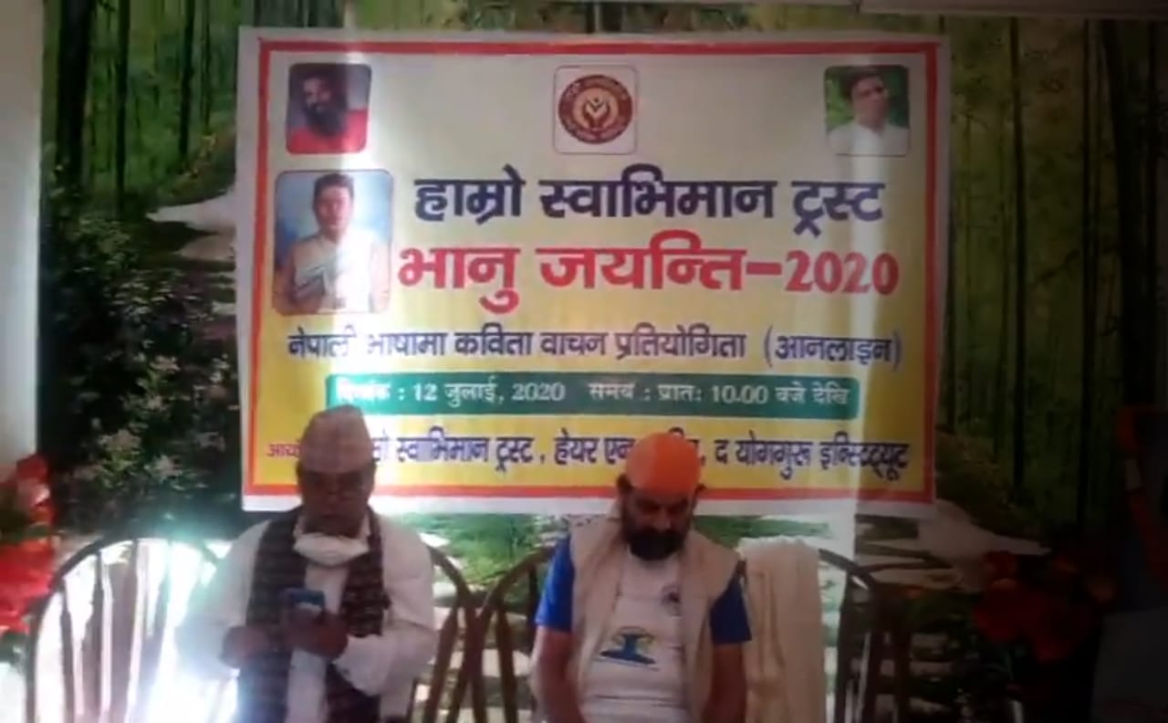 हाम्रो स्वाभिमान ट्रस्टले आइतवार आदिकवि भानुभक्त आचार्यको 206 औं जन्मजयन्ति मनाएको छ । भानु जयन्तिका अवसरमा हरेक वर्ष वृहत रुपमा कार्यक्रम गर्दै आएको ट्रस्टले यसपाली भने कोभिड-19 प्रकोपका कारण भर्चुअल रुपमा कार्यक्रम गरेको हो । जन्मजयन्तिका अवसरमा राष्ट्रीय स्तरको कविता वाचन प्रतियोगिता गरिएको थियो। विहान 10 बजेबाट शुरु भएको यस कार्यक्रममा भारतका विभिन्न क्षेत्रबाट मानिसहरु सहभागि भएका थिए । जुम मिटिङ मार्फत गरिएको यस कार्यक्रमलाई विभिन्न फेसबुक पेजहरुबाट प्रत्यक्ष प्रसारण गरिएको थियो ।