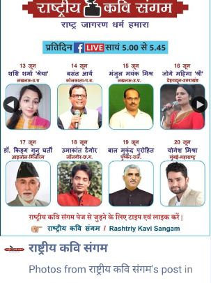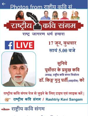 दिल्लीबाट सञ्चालित राष्ट्रिय कवि सङ्गम संस्थाले सप्ताहब्यापी अनलाइन कविता गोष्ठीको आयोजना गरेको छ। विगत 16 जूनबाट शुरू गरिएको गोष्ठीको समापन आगामी 22 जूनमा हुनेछ। यो गोष्ठीमा मिजोरमका बहुप्रतिभाशाली, नेपालीभाषी ब्यक्तित्व डा. किङ्ग गुनु घर्तीले पनि आफ्नो प्रस्तुति दिएका छन्। डा. किङ्ग हिन्दी भाषाको यो गोष्ठीमा मौका पाउने एक मात्र नेपालीभाषी प्रतिभा हुन । उनलाई राष्ट्रिय कवि सङ्गमले 17 अगस्ट 2014 मा असमको गुवाहाटीमा आयोजित समारोहमा विशिष्ट साहित्य सम्मानले सम्मानित गरेको छ। यसरी नै 11 अगस्ट 2016 को दिन राजस्थानको बिसाऊमा साहित्य श्री सम्मानद्वारा सम्मानित भइसकेका छन् ।