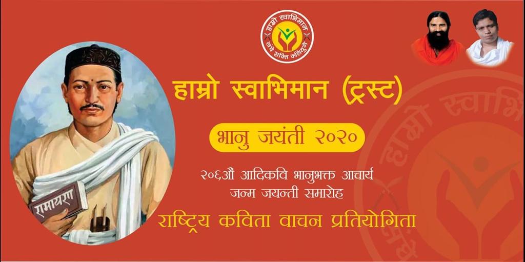 भानु जन्म जयन्ती यही आषाढ २९ गते आज विश्वभर छरिएर रहेका नेपाली भाषीहरुले २०६ औं भानुजयन्ति मनाईरहेका छन् । भानु जयन्तिकै अवसर पारेर भारतमा परम पुज्यनीय स्वामी श्रद्धेय बालकृष्ण आर्चाय आयुर्वेद केन्द्र पतंजलि योगपीठका अध्यक्षको मार्गदर्शन आशिर्वादले निर्देशनमा ” हाम्रो स्वाभिमान ट्रस्ट भारतले २०६ औं भानु जयन्ती आदिकविलाई सम्मान गर्दै राष्ट्रीय कविता वाचन प्रतियोगिता कार्यक्रम २०२० भानुभक्तको कृतित्व र व्यक्तित्वका आयामलाई समेटेर विभिन्न कार्यक्रम आयोजना बिगत देखि गर्दै आएको छ ।