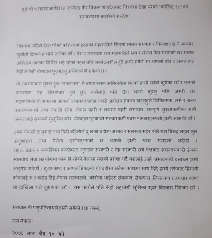 मंगलबार एक विज्ञप्ति निकाल्दै पूर्वराजा शाहले यो विश्वव्यापी महामारी विरूद्ध लड्न सरकारले ल्याएका निर्देशन पालना गर्न पनि नेपालीहरुलाई अनुरोध गर्नुभएको छ। विज्ञप्तिमा लकडाउन अनिवार्य आवश्यकता भएकाले यसमा गैरजिम्मेवार हुने छुट कसैलाई पनि नभएको पूर्वराजा शाहले उल्लेख गर्नुभएको छ।